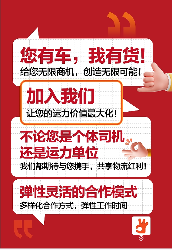 合作收益分配透明公正,每一筆訂單的收益都能在平臺上清晰查看。平臺會根據(jù)不同的訂單類型和運(yùn)輸距離,制定合理的收益分配方案,確保您的勞動得到應(yīng)有的回報。銀行直接清分,及時付款:我們承諾按時結(jié)算運(yùn)輸費(fèi)用,確保您的現(xiàn)金流穩(wěn)定。提供多種結(jié)算方式,方便您快速獲取收益。彈性靈活的合作模式多樣化合作方式:根據(jù)您的實際情況,提供多種合作模式選擇,包括全職合作、兼職合作等。無論是個人司機(jī)還是車隊公司,都能找到適合的合作方式。彈性工作時間:您可以根據(jù)自己的時間安排接單,不受固定工作時間的限制。靈活安排工作時間,平衡工作與生活。
